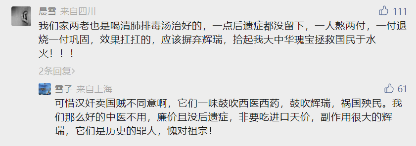 自12月7日放开以来,短短20多天时间里,全国感染近70%,院士泰斗讣告频出,火化场人挤人,辉瑞西药还进了北京医保…三年的抗疫经验,曾经的中西医结合,在这一刻都化为了泡影。连花清瘟与布洛芬之争,张网红VS饶校长,白肺重症死亡率40%,老百姓们陷入恐慌之中…2020年4月17日,国务院的联防联控发布会上,北京中医药大学副校长、国际欧亚科学院院士王伟介绍了目前清肺排毒汤在武汉疫情的临床使用和救治情况,并明确提出:清肺排毒汤就是治疗此次新冠肺炎的特效药!截至4月12日零时,收治的病人有1262例,现在已经有1253例治愈出院,治愈出院率达99.28%;这1262例中,没有一例是轻症转为重型、普通型转为危重型的病例。放开后,疫情战场上的主流药物,要么是吃了有大量后遗症的西药退烧药,要么是寒凉的中成反药,以及被炒上天的美国“特效药”,可以说是群魔乱舞。而武汉疫情时期的原始毒株,是现在奥密克戎毒性的40倍。清肺排毒汤在当时都能取得治愈率高达99.28%,零加重,零复阳,零后遗症的辉煌战果,如今却惨遭西药利益集团持续打压,当老百姓真正需要时,连报道都不报道,无极君深感寒心。每天关注无极太极公众号的粉丝们,都知道有“清肺排毒汤”这个良方,几乎每次疫情,无极君都会提到它。很多人不确定能不能用,于是私信问我,因为这是治疗原始新冠的药物,用在奥密克戎上会不会药力过猛。无极君表示:从2020年的新冠病毒诊疗方案(第七版)到2022年的第九版,清肺排毒汤一直都在诊疗方案中。而且这3年疫情,不管是阿尔法、德尔塔,还是奥密克戎,只要哪地方有疫情,清肺排毒汤必然会出现在该地的方舱医院中;现在疫情全面放开了,有些中医门诊还在陆续发放,但由于某些原因,从来没有主流媒体去专门报道,原因大家都懂。清肺排毒汤的拟方人,并非是某些所谓的国医院士,也不是网红专家教授,而是一位民间的无证中医——葛又文。据公开资料显示,葛又文出身中医世家,对药典钻研数年,在拟出清肺排毒汤后,被中国中医科学院特聘为研究员。一个无证中医拟出了这么一个“大疫良方”,真不知抽了多少网红砖家们的脸,全面放开后还有脸将它雪藏。感染前说超90%无症状小感冒多喝热水就能好,感染后把2000多块钱的辉瑞西药紧急送入北京医保,还引导各路自媒体鼓吹“中国缺乏特效药,那么用辉瑞西药也不错”…一问,上海疫情,远超90%无症状感染者从何而来,谎报军情,该当何罪?二问,上海疫情,中医药全面参与治疗,疗效如此之高,网红砖家是眼瞎真看不见,还是假装看不见,还是不敢看见?既然如此,为何还要大力引进洛克菲勒资本下的辉瑞新冠药,充当美国资本的走狗?清肺排毒汤,在连续3年的疫情抗击中,有两大绝妙特点。特点一:对患者肺部能有效去邪,并对心肝、肾有协同保护作用。肺部灼热之邪,没有清出去,就会严重影响心、肝,人体内气机循环靠肝气的调达。而很多抗病毒的西药,会对患者的肝造成很大的损伤,以致到最后病毒还没杀死,病人已经快不行了。比如已故李文亮医生,就是一直采用抗生素、激素、抗病毒类药物和高流量吸氧治疗。最后的结果就是,其在病毒转阴两天后,依然不幸去世。现在的奥密克戎,很多人在感染后出现了心肌炎、肺炎等后遗症,这些都和错误/不全面的治疗方式有很大关系,用清肺排毒汤,可有效避免。从左到右:北京中医药大学副校长王伟、清肺排毒汤拟方人葛又文特点二:该方剂不以药为单位,而以方剂为单位去作战,方与方协同配合,使其在同等药量的情况下产生几倍量的效果,让寒湿热毒排出的速度更快。在清肺排毒汤处方中,细辛的用量是6克,超出药典的标准,但在葛先生看来,想要破除湿毒郁肺,就要温肺化饮,应对疫情,3克达不到效果,前三付建议用到6克,这是医生在临床中常用剂量。另外,之所以要快速排出寒湿疫毒,是因为新冠病毒的本质是寒湿疫,寒湿祛除了,症状自然就消了,核酸也会随之转阴,患者不光没有生命危险,后遗症也不会存在。2020年初,西医主治时期,死亡率居高不下,中医被孤立在外。《柳叶刀》记载:2019年12月24日至2020年1月26日(西医掌控话语权)期间,新冠重症患者死亡率高达61.5%。后来经过了不懈努力与争取,领导人在会议上的不断强调,1月28日下午,陆续才有患者自愿尝试中医治疗,中医药此时才真正走入战场。1月27日,河北省中医院呼吸一科主任耿立梅诊治一位确诊高烧重症患者,发烧到39.5度,28日晚加服清肺排毒汤治疗,服用1付药后,29日下午,体温、白细胞就恢复正常。随着患者和临床医生都观察到好疗效,使用的人迅速增多。拟方人葛又文说:“中医药治疗流感等疫病,如果病因病机分析透彻,遣方用药合理严谨,1天见效,3天扭转病情,一周左右基本痊愈。否则就说明方不对症。”毒性最强的原始新冠,都能在一周左右基本痊愈,而如今的奥密克戎,我们的专家们居然能把病治成“症状持续十多天”,甚至还能发展成心肌炎、白肺…无极君每当看到这,既痛心,又愤怒!美国插旗百万,那是非我族类!但现在伤害的都是中国老百姓,绝不容魑魅魍魉们造次,无极君不会袖手旁观!另外,新冠肺炎治疗的价格,据国家医保局公布,重症患者人均治疗费用超过15万元。而单独使用清肺排毒汤,药费不到200元,且起效更迅速,效果更好,一个疗程仅需3天。即使现在,一个所谓的辉瑞“特效药”卖到2300元,虽然进了北京医保,但到底