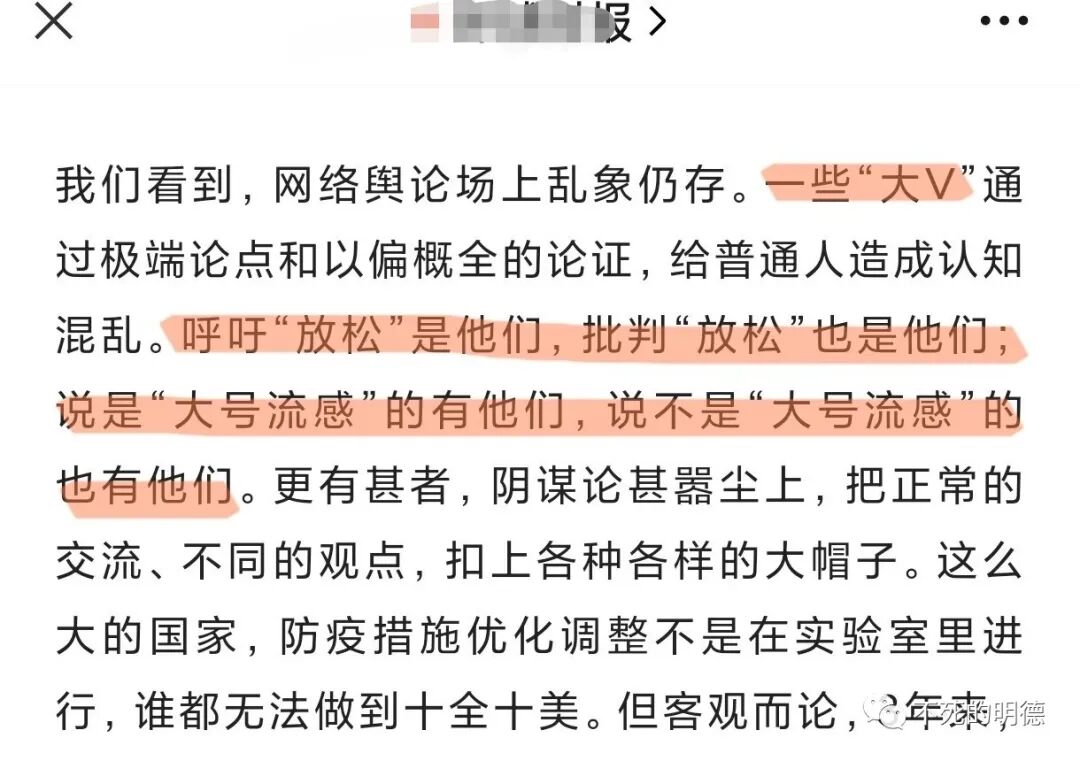 有些媒体,迫不及待地跳出来,不讲是非曲直、不分青红皂白,对于群众的质疑(专家说无症状90%以上、发烧率4%)视而不见,对于群众的关切(为什么买不到药、老人孩子阳了怎么办)置之不理,上来就是移花接木、栽赃陷害(全国人都知道“大号流感论”的提出者是谁,媒体却移花接木成“网络大V”,明目张胆地把水搅浑,让人瞠目结舌),接着就是扣帽子、打棍子(把群众对专家们90%无症状、4%发烧率的合理质疑,倒打一耙成攻击专家),最后再来一出悲情戏:不能让网红专家寒心!