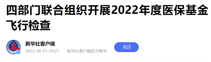 5月31日,国家医保局公众号发布一份重要文件。这份文件的名称叫《国家医保局 财政部 国家卫生健康委 国家中医药局关于开展2022年度医疗保障基金飞行检查工作的通知》