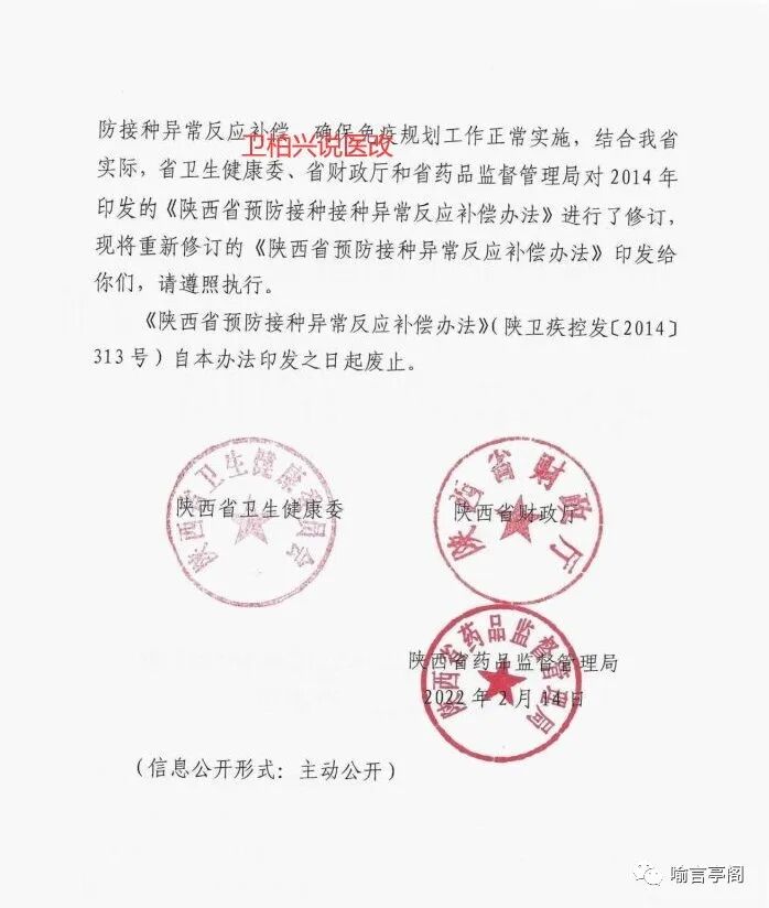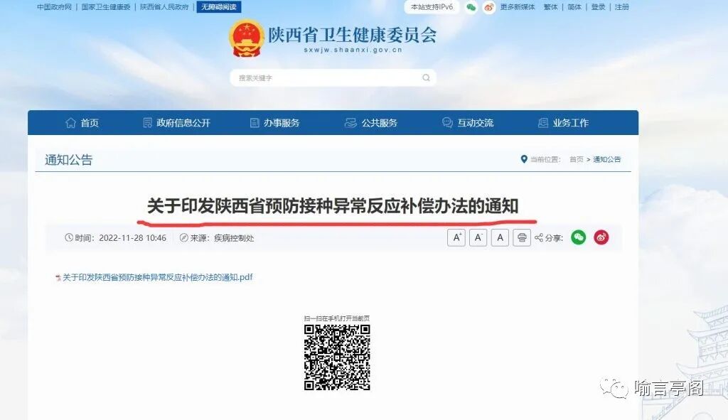 陕西省卫健委的这个通知,又向本着对民众的健康负责,本着实事求是的态度进了一大步,公开了预防接种异常反应补偿办法,不再藏着掖着,不再把异常反应的情况作为秘密。