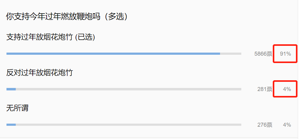 此前,我曾在燕馆做过一个关于是否支持恢复过年燃放烟花爆竹的小调查,调查显示,91%选择支持,但也有4%反对。支持有支持的理由,反对有反对的道理,大家可以去燕馆投票。