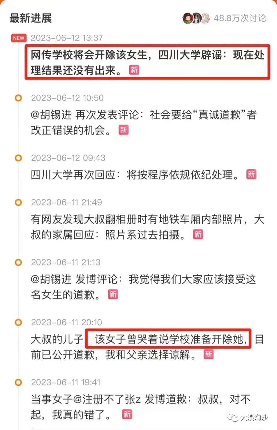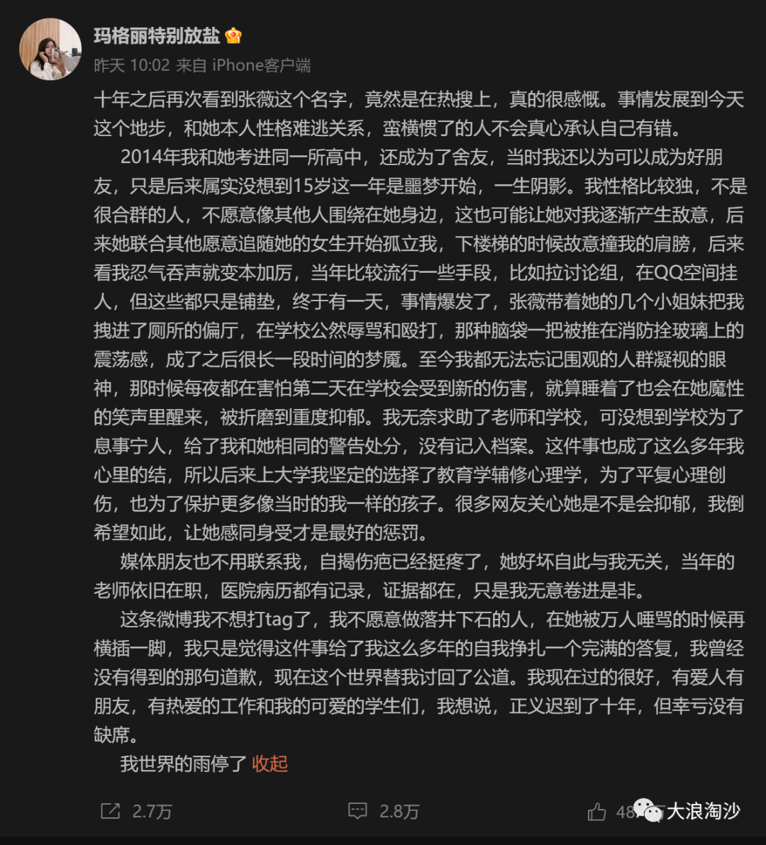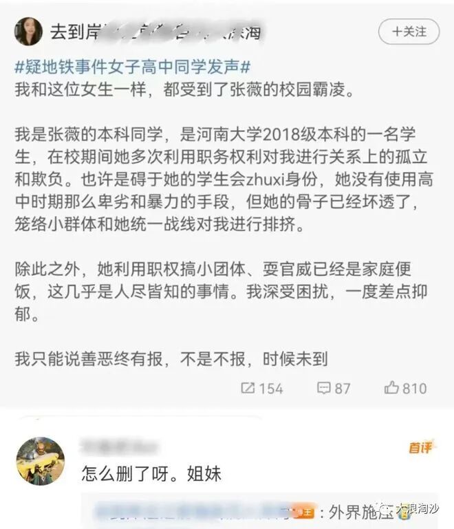 这种事情我建议指名道姓,具体到特定的人——我看很多媒体报道的时候都说“川大研究生地铁污蔑案”,这个aoe容易误伤,我看川大学子就有很多仗义执言要求严惩的。 这件事情我一直在写着,但无奈各种信息更新太快,比如昨天刚刚爆出来,张薇早年是校园霸凌作恶者,受害者当时几乎自杀,多年才走出来: 所以张薇其人的性格画像也逐渐明晰了:这就是最纯粹的恶,她就是一个通过无底线欺压弱者,来达到自己的利益或其他种种目的这类人。所以我劝局限于性别议题依然想为张薇开脱的人两句:张薇看见同学好欺负的时候就欺负同学,看见地铁大叔好欺负的时候就会欺负地铁大叔,将来看见你好欺负的时候也会欺负你。 我昨天晚上还跟一个心理系的朋友聊天,他说张薇这种人的就是典型的“小人人格”,这种人不会出心理问题的,因为他们是极端自私的一群人,而且能把一切恶行都自洽。说如果张薇将来“打抑郁牌”,不敢说一定至少装的概率大;如果不是装的,建议去他们学校就诊,他巴不得有一个如此典型的特例来分析。当然这话是出于他科研人员的严谨和博爱。他还说,张薇这种性格在大公司、体制内包括高校内都会特别吃香,这些人的特点是:通过无底线伤害下位者,从而去讨好上位者。这种人会最善于穷尽身边所有的可能性,去完成一个极端的目标——比如她是学新闻传播专业的,她把用小作文翻覆舆论的表面技巧都学会了。老板、领导、导师们,身边就喜欢养几条这种“狗”。 我想了想,她能走保研这条路到川大,一定是在学校混得很开的人,而且她还是个党员唉……所以其背后有着劣迹斑斑的校园霸凌问题,在校领导眼中恐怕就是另一个版本了。毕竟她污蔑完地铁大叔之后,还理直气壮发了微博—— “如果没有偷拍为什么不为自己发声呢”“我的权益没有受到侵害我就不能去维权了吗”“猥琐老头”“猥琐男必4”……——可以想象,在校园霸凌捅到老师和校领导那里去的时候,她是怎样一副理直气壮的嘴脸去颠倒黑白的,可以想象被霸凌的同学在她的伶牙俐齿面前是多么的无助与迷茫。 甚至可以说,她今天污蔑地铁大叔的嘴脸,就是她一直以来无法无天慢慢培养成的。她看自己同学性格比较孤独,就去霸凌;她看地铁大叔老老实实蹲在那里,就去污蔑。现在能受到网友的制裁,只能说善恶终有报,天道好轮回。 所以我再劝囿于性别议题的朋友们重新审视一下“张薇污蔑案”的本质:她以前校园霸凌内向的同学,讨好学校和老师;现在霸凌老实的大叔,在舆论场上获利。她之所以选择小作文打拳,是因为这是一个小作文打拳的版本,她是学习新闻传播专业的,知道如何操纵舆论能让自己获益最大化——只不过机关算尽太聪明,反误了卿卿性命。如果打拳和小作文的版本过去了,以张薇的聪明劲儿和那种不要脸的精髓,一定又会最快速度找到强势的新版本,唯一不变的是她脚下一定又会踩着新的“老实人”们。 所以这种善于利用、钻营、踩着别人上位的小人,究竟是让女性处境更好呢,还是更糟糕了呢?是让大家更重视地铁偷拍问题呢,还是让真正被偷拍的人难以维权了呢? 就像我在疫情期间说过的这个问题:谁才是真正破坏动态清零的人?是抱怨两句的老百姓吗?不是,绝大多数老百姓发两句牢骚,但是从来都是配合国家政策的。真正破坏动态清零的,是那些层层加码的政策、尸位素餐的官僚、不作为或乱作为的基层、发疫情财的“龙王”们。 我们类比一下哈,偷拍犯就是病毒,人人得而诛之。那么我请问,打着维护女性权益的大旗,写小作文造谣污蔑的人,应该把他们匹配到哪个生态位?
